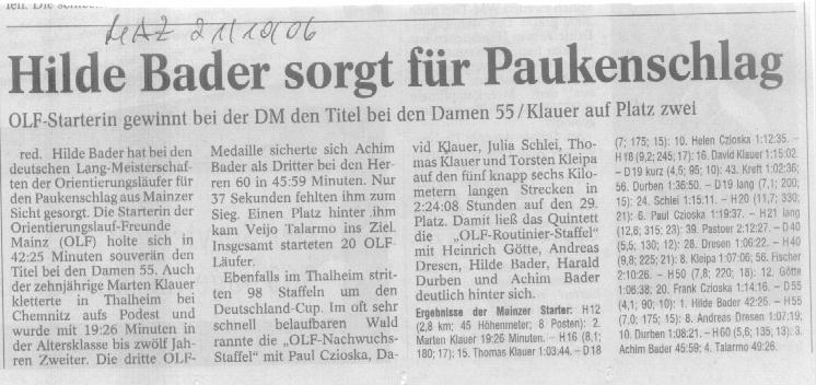 In den verschiedenen Altersklassen gingen auch 20 Mainzer Orientierungsläufer der OLF Mainz an den Start. Den größten Erfolg konnte Hilde Bader bei den Damen 55 feiern. In 42:25 Minuten siegte sie souverän und wurde Deutsche Meisterin. Der noch 10jährige Marten Klauer wurde 2. bei den Herren bis 12 Jahre. Achim Bader erreichte bei den Herren 60 in 45:59 Minuten einen hervorragenden 3. Platz. Ihm fehlten nur 37 Sekunden zum Sieg! Veijo Talarmo kam auf den 4. Platz.